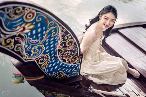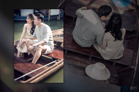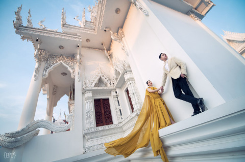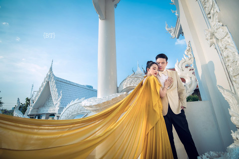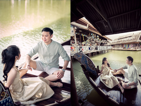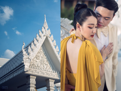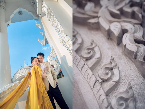 We then made our way to the Pattaya Floating Market. Here, we indulged a bit on the exotic flavors of the local cuisine, embracing the vibrant culture and traditions. A boat ride added an extra layer of charm to this shoot, allowing our couple to immerse themselves fully in the unique location. But our adventure didn’t stop there, our final destination was an illustrious white temple that wasn’t even on Google maps. This architectural masterpiece stood out like a radiant jewel amidst the lush Thai landscape.